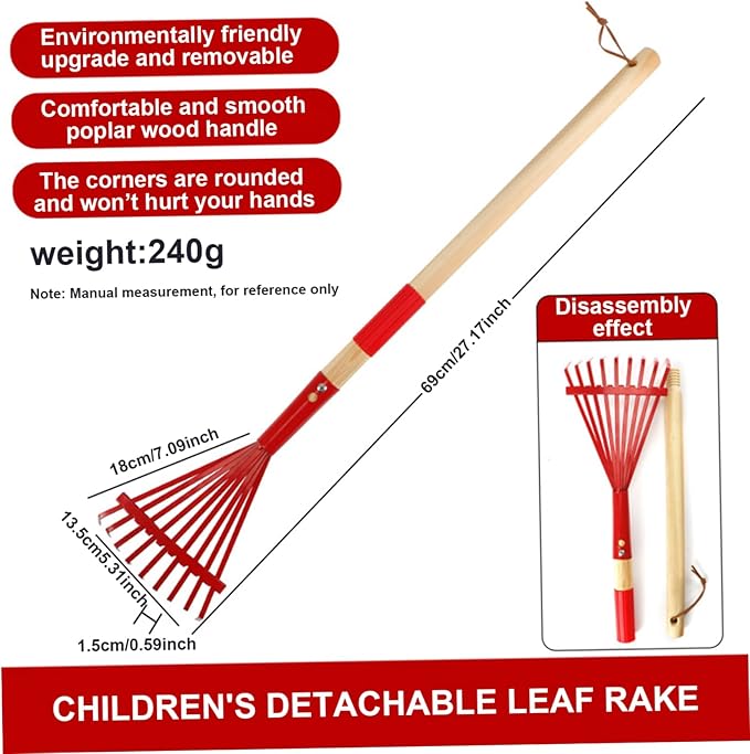 - Durable Construction for Endless Fun: Crafted with durability in mind, this leaf rake for lawn is built to withstand the enthusiastic play of little gardeners. The sturdy wooden handle ensures a comfortable grip for small hands, making it easy for children to join in the gardening fun.